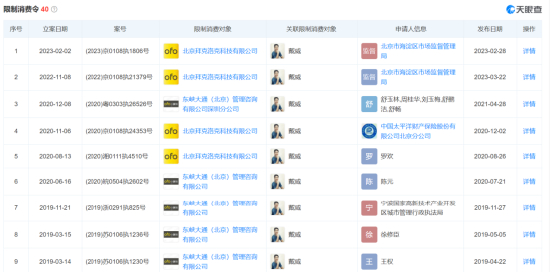 风险信息显示,戴威名下存在40条限制消费令,均涉及ofo相关公司案件。