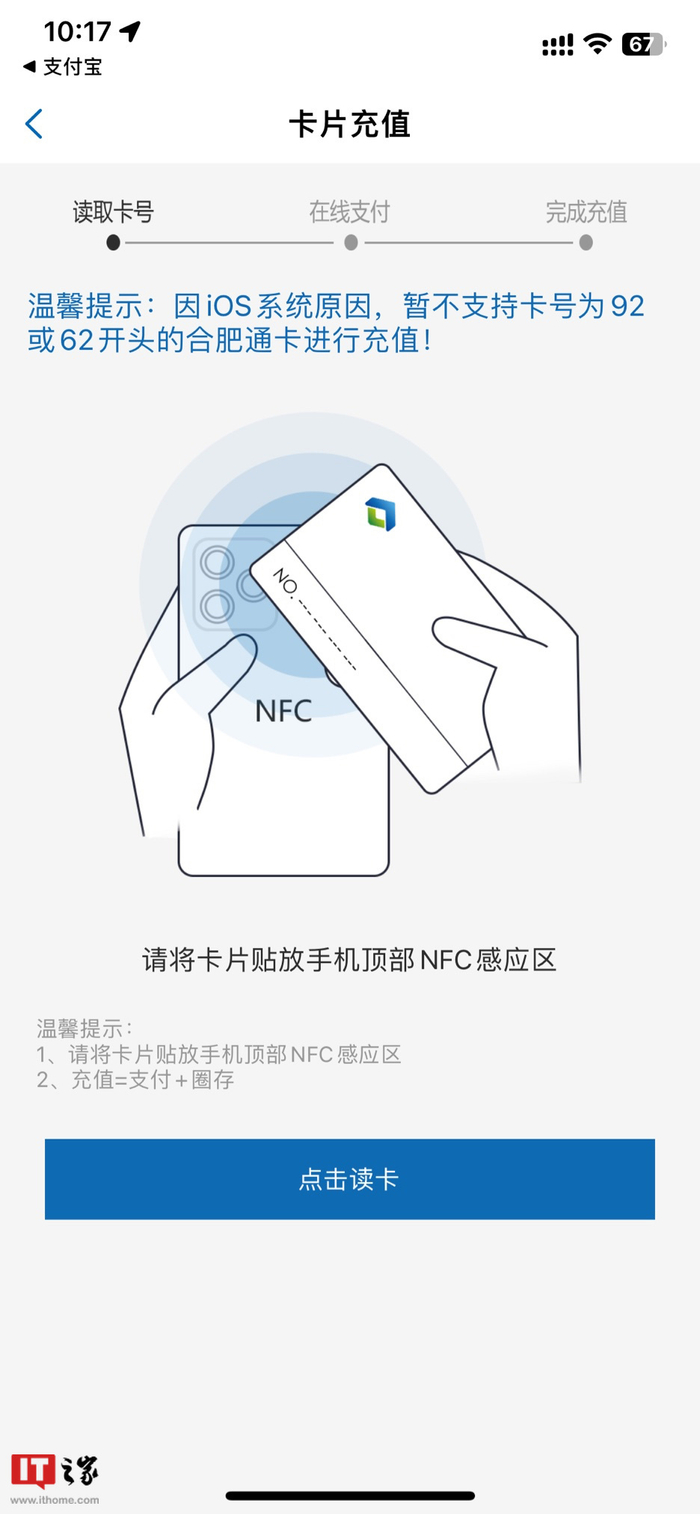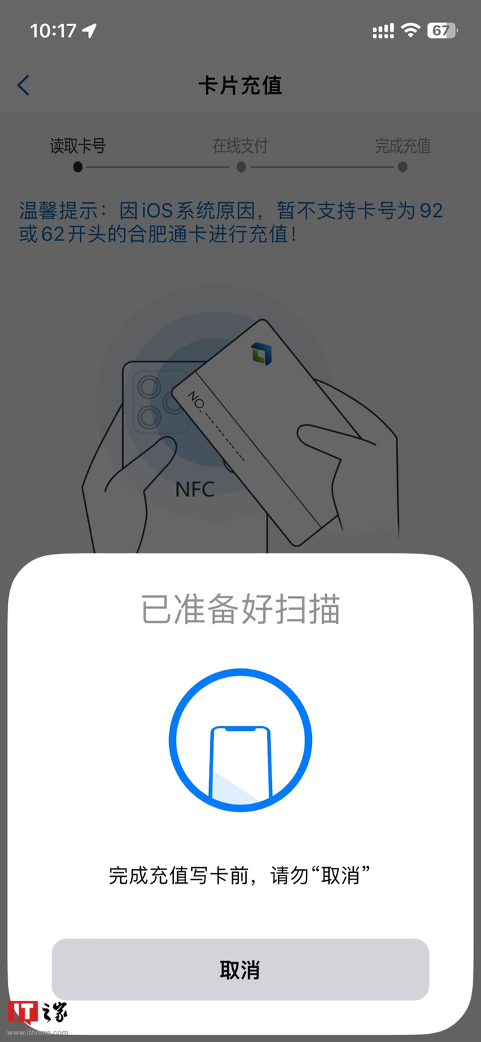 需要注意的是:因 iOS 系统原因,暂不支持卡号为 92 或 62 开头的合肥通卡进行充值。