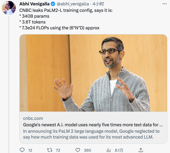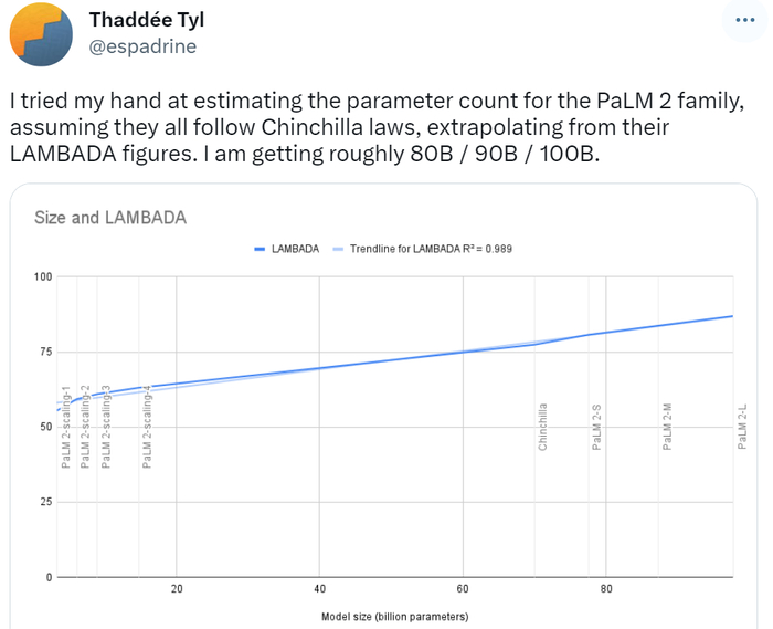 在官宣 PaLM 2 之初,就有网友根据 Chinchilla 定律预测其参数量,ta 预测 PaLM 2 模型家族的参数结果为 80B / 90B / 100B 不等,和这次爆料的 340B 还是差距很大的。