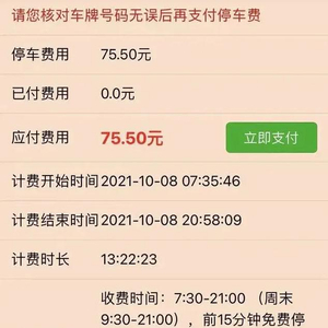 一位西宁市民发布的收费截图显示,该市民早上7:35停车至晚上8:58离开,累计停车时长13个小时22分23秒,需缴纳停车费75.5元。收费规则显示,前15分钟免费停放,从计费开始时间起,停放15分钟之后:前2小时1元/辆·15分钟;2小时后1.5元/辆·15分钟。收费时间为7:30-21:00(周末9:30-21:00)。