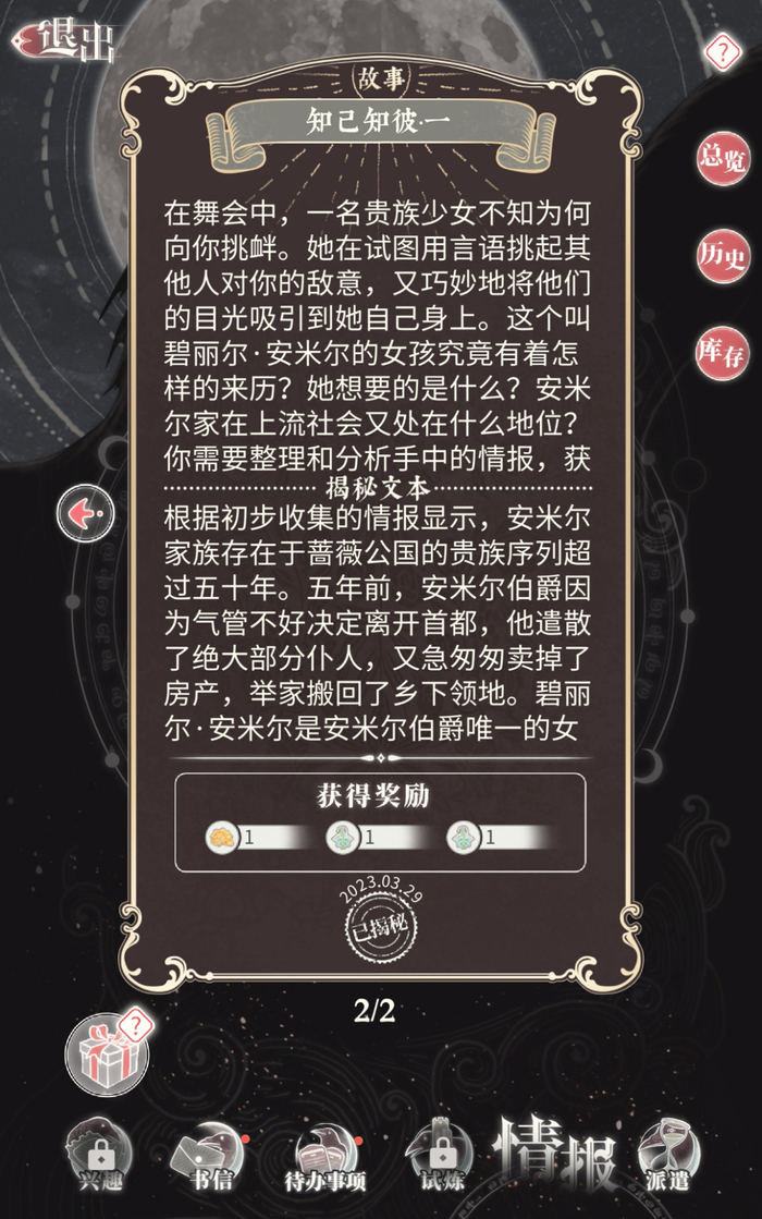 除去常规的主线推进之外,游戏还另有‘书信’’情报‘等玩法用以展开剧情。在书信系统中,玩家能接收到其他NPC发来的信件;情报系统里,玩家可以通过派出下属来打探到有用的情报。