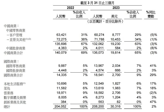 在抵消跨分部交易的影响后,季度内云业务收入为185.82亿元,同比下降2%。抵消前云业务总收入合计为245.59亿元,同比下降3%。经调整EBITA为3.85亿元,2022年同期为2.76亿元。