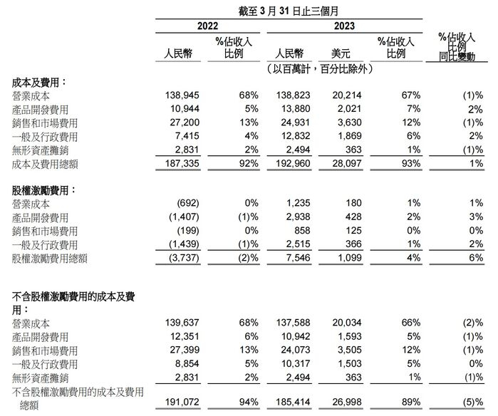 营业成本为1388.23亿元,占收入比例67%,2022年同期为1389.45亿元。销售和市场费用为人民币249.31亿元,占收入比例12%,2022年同期为272亿元。产品开发费用为138.80亿元,占收入比例7%,2022年同期为109.44亿元。若不考虑股权激励费用的影响,上述几项费用占收入比例均可再下降1%。而一般行政费用为128.32亿元,占收入比例6%,2022年同期为74.15亿元,不考虑股权激励费用影响则约占5%。
