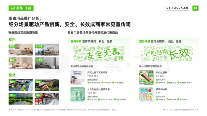 卧室、卫生间等室内场景成驱虫用品的核心消费场景,商家推广时也多围绕家庭常见的杀蟑驱蚊需求,来强调产品安全无毒、温和不刺激等特性。