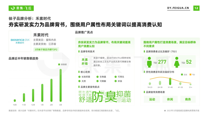 “强研发实力+深挖消费者需求”,让这个成立不到5年的新锐品牌在抖音的销售成绩一路高歌猛进。3月份品牌以超过1500w的预估销售额,登上袜子品类销售月榜TOP2。