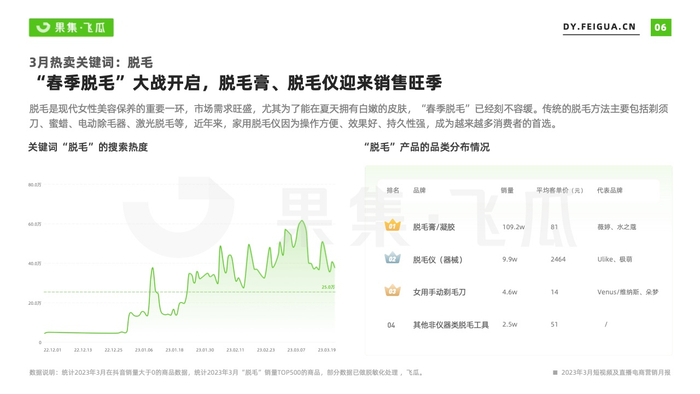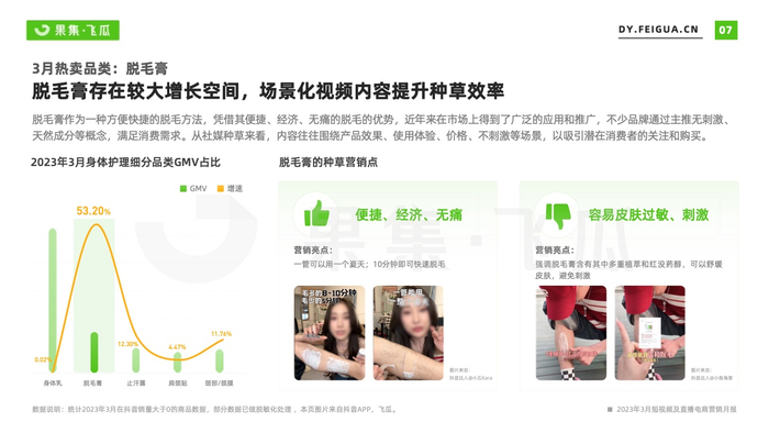 据飞瓜显示,3月份的身体护理大盘中,脱毛膏/凝胶的市场份额较2月提升7%,仅次身体乳/霜/精油品类。