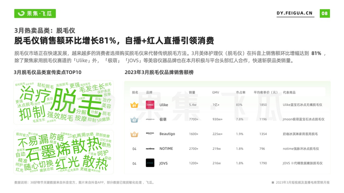据飞瓜统计,3月份美体护理仪(脱毛仪)在抖音上的销售额,环比上月增长81%。