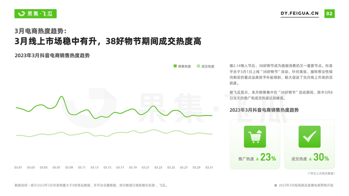 飞瓜显示,3月份抖音销售热度集中在“38好物节”活动期间,且3月8日当天的推广和成交热度达到峰值。