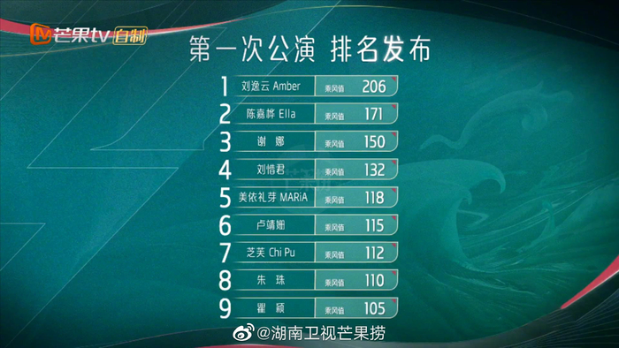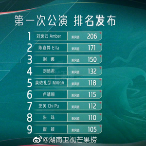 今(19)日中午,《乘风2023》第一次公演排名发布:刘逸云Amber以206票毫无悬念地获得第一;陈嘉桦Ella以171票排名第二,谢娜以150票排名第三。