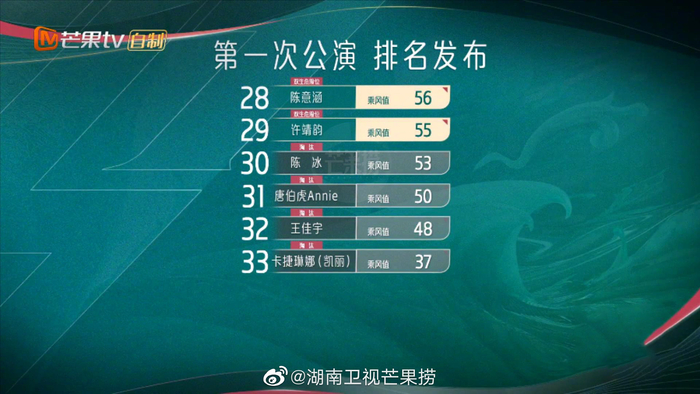 值得一提的是,此前因舞台划水备受争议的徐怀钰排名第27位,拿到最后一个晋级席位;陈意涵、许靖韵位列双生危险位——双生危险位小组考核靠后的一位将被淘汰无缘二公舞台;陈冰、唐伯虎Annie、王佳宇和卡捷琳娜(凯丽)四位姐姐则因排名靠后被淘汰。