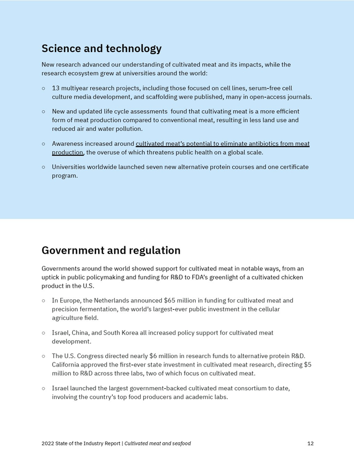 在美国,FDA 完成了对一种人造肉类产品(UPSIDE Foods 的养殖鸡肉)的首次上市前审查,还有其他几项审查正在进行中。