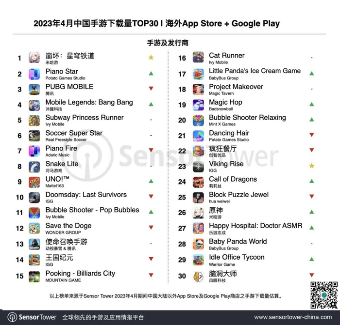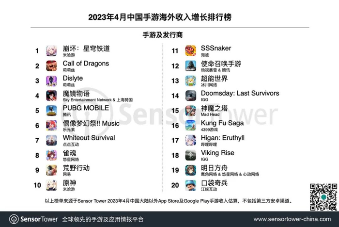 Sensor Tower:2023年4月成功出海的中国手游