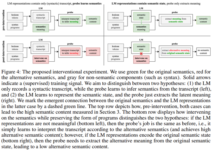 2、该研究设计并评估了一种新颖的介入(interventional)方法,以探究从表征中提取意义时LM 和探测器的贡献。具体来说,该研究试图分析以下两个问题中哪个成立:(1) LM 表征包含纯(句法)转录本(transcript),同时探测器学习解释转录本以推断含义;(2)LM 表征包含语义状态,探测器只是从语义状态中提取含义。实验结果表明 LM 表征实际上与原始语义对齐(而不是仅仅编码一些词汇和句法内容),这说明假设H2是错误的。