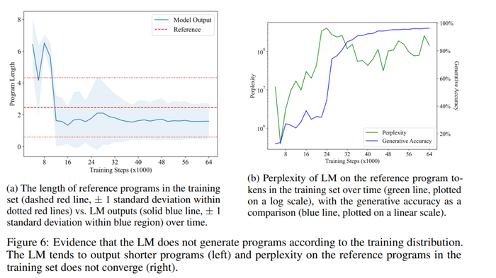 最后,他们还测量了LM在训练集中的程序上的困惑度随时间的变化情况。图6b展示了他们的结果。可以看到,LM从来没有学会很好地拟合训练集中程序的分布,这进一步反驳了H1的观点。这可能是因为在训练集中随机抽样的程序包含了许多无操作指令,而LM更倾向于生成更简洁的程序。有趣的是,困惑度的急剧增加——当LM超越了模仿阶段——似乎导致了生成准确率(和语义内容)的提高。由于程序等价性问题与程序语义密切相关,LM能够生成简短且正确的程序表明它确实学到了语义的某个方面。