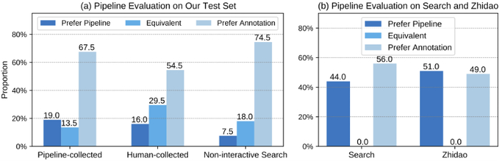 此外,作者也将整体 pipeline 应用于 DuReader 中文 QA 数据集(包含 Zhidao 和 Search 两个子数据集),并比较了模型生成的答案和人工标注的答案,从上图 (b) 可以观察到模型生成的答案比 DuReader 标注答案更好的情况接近 50%,这反映了该模型强大的泛化能力,体现了 WebCPM 数据标注的高质量。