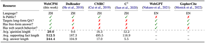 基于这个界面,作者构建了中文领域首个基于交互式网页搜索的 LFQA 数据集。它包含 5,500 对高质量的问题 - 答案对以及十万多条真实用户网页搜索行为。与现有的中文问答数据集相比,WebCPM 的问题、支持事实和答案都更长,体现了其问题的复杂性和答案内容的丰富性。