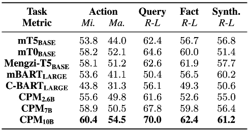 作者测试了多个有代表性的中文大模型,并得出以下结论(结果如上图所示):不同模型在四个子任务上的性能各有优劣。例如在搜索行为预测、查询语句生成和支持事实摘要中,mT0 的表现优于 mT5,但在综合信息方面表现较差。此外,CPM 系列模型的性能随着模型参数量的增加也不断提高。得益于 scaling law ,更大的模型通常拥有更强的理解和生成能力,能表现出更好的下游任务性能。