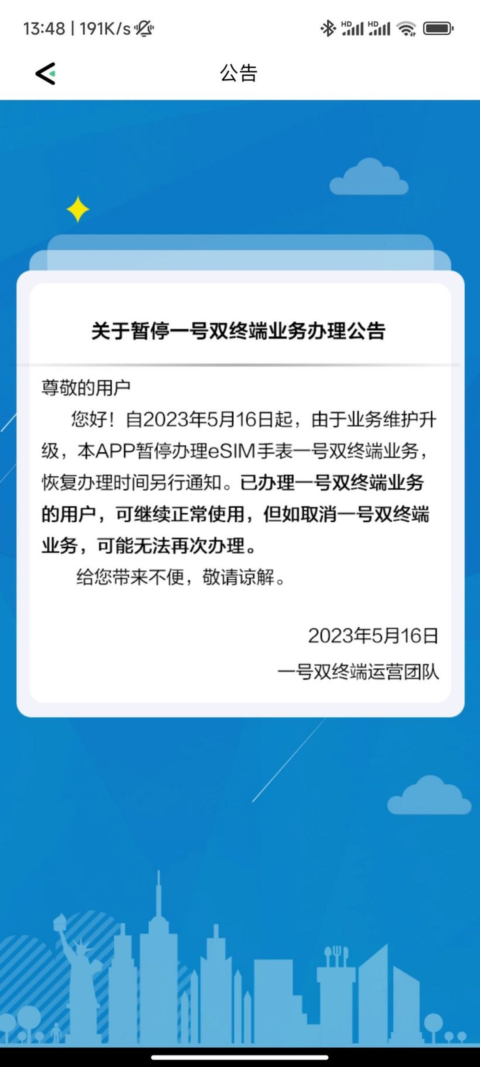 尊敬的用户您好!自 2023 年 5 月 16 日起,由于业务维护升级,本 App 暂停办理 eSIM 手表一号双终端业务,恢复办理时间另行通知。已办理一号双终端业务的用户,可继续正常使用,但如取消一号双终端业务,可能无法再次办理。给您带来不便,敬请谅解。