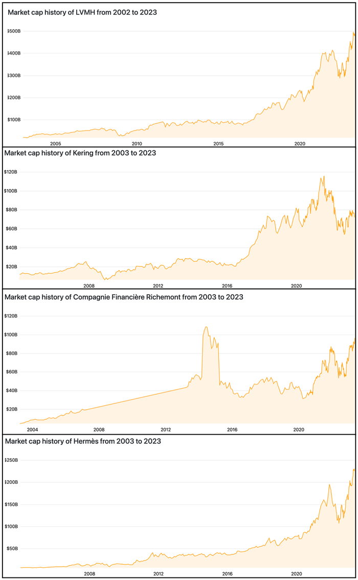 恐怕没有比奢侈品能更好诠释“品牌魔法”的例子。列出当今全球市值最大的10家公司,会发现奢侈品集团LVMH在上月以首次突破5000亿美元市值,跻身苹果、微软、谷歌以及英伟达等一众科技巨头的行列。