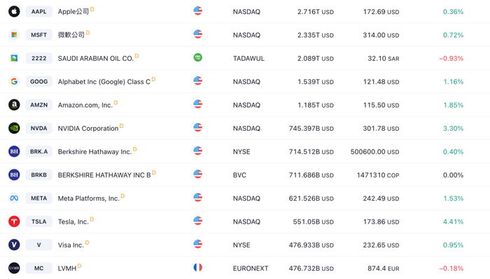 4月13日LVMH市值突破5000亿美元,截至发稿前被Visa挤出前10