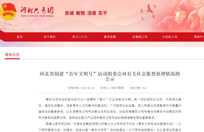 据该公示显示,“据唐山某市民反映,中国电信集团有限公司唐山分公司存在不符合《青年文明号活动管理办法》(以下简称管理办法)的情况。”此后又经过一系列考证核查和研究,依据管理办法监督检查和惩戒相关条款,决定撤销唐山电信装维团队的这一荣誉称号。