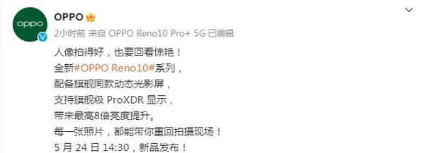 【手机中国新闻】OPPO Reno10系列将于5月24日14:30正式发布,现在距离新机亮相还有2天时间,先来关注官方预热消息。