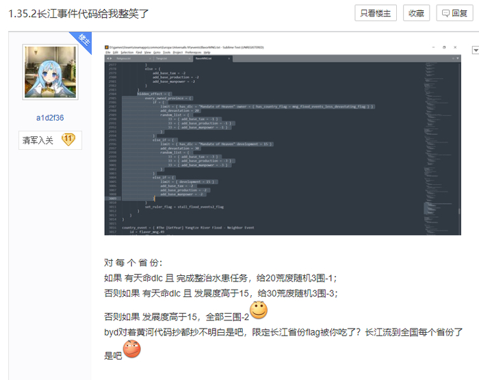 只是修改代码时犯下的疏忽,让他们闹出了一个大笑话:洪水的生效范围,扩大至中华帝国控制的所有省份,不论省份是否靠近长江黄河。在做完包括“驯服水患”在内的特定任务后,连发展度≥15的限制也消失了。