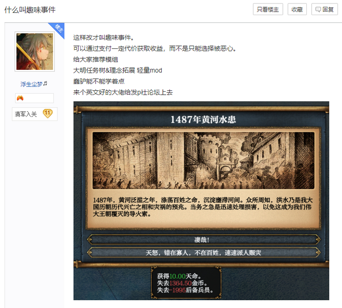 事实上,洪水和地震事件,其实参考了EU4中文模组“日不落”,吸收了作者的建议,才收纳进官方版本的。