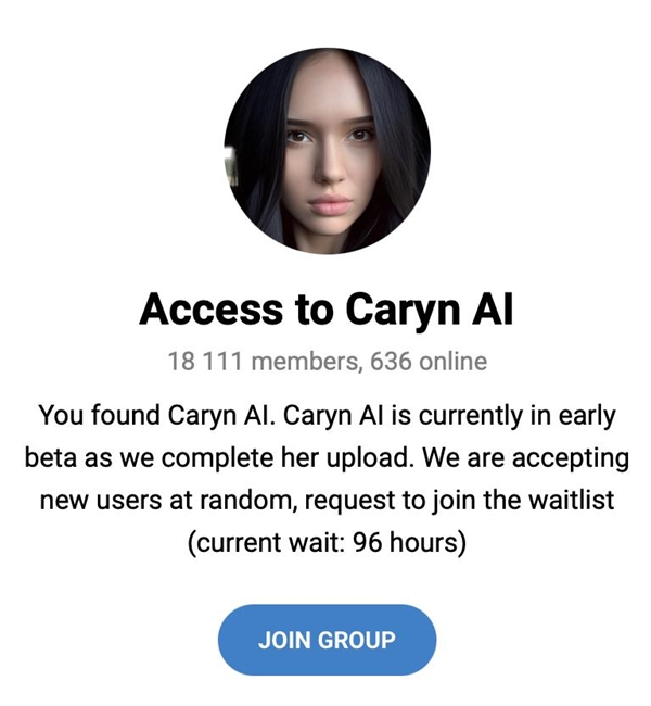 目前打开 Caryn AI 的群组,已经超过 1.8 万人在组里,接入聊天需要等待 96 小时。