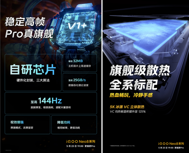 另一颗则是自研芯片V1+,数据吞吐理论速度至高25GB/S,片上高速缓存等效32MB,不仅可协助天玑9200+释放更强性能,开启原画模式之后视效更为出色,相同帧率更低功耗。与此同时,iQOO Neo8系列还内置5K冰瀑VC立体散热,VC均热板面积提升至125%,带来游戏时的冷静手感。