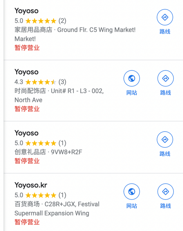 目前,在谷歌地图上搜索部分品牌门店,可以看到大量“暂停营业”的信息。