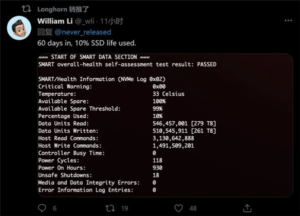 比如之前 Mac 的一些 BUG ,导致用户用了 60 天就消耗了这块 256G 闪存 10% 的写入寿命。