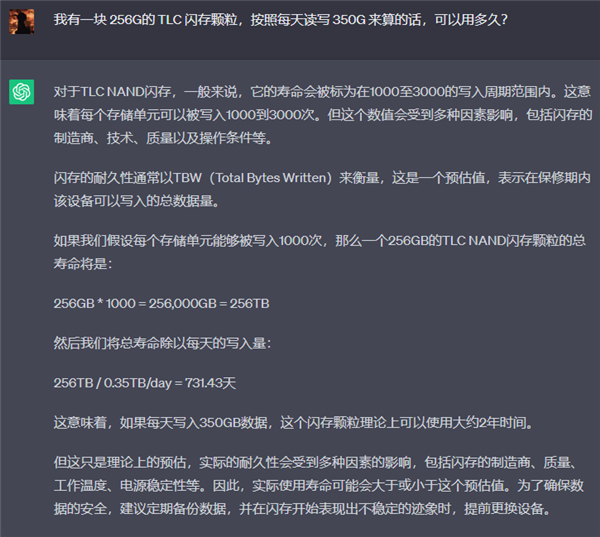我掐指(用 ChatGPT)一算,就拿目前手机里常见的 256G TLC 闪存颗粒来说,按照 1000 次的擦写寿命来算,咱们想在两年内用坏,每天得要写入 350G 数据才行。