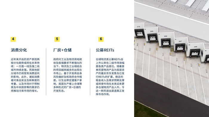 近年来开启的两极分化或将在未来持续:一方面一线及强二线城市资产表现持续走强,而其他部分城市仍将受到消费逆风的影响。此外,诸如消费者对食品安全及新鲜度的考量,以及市场对于预制菜及中央厨房等的需求仍将推动冷库市场的增长。