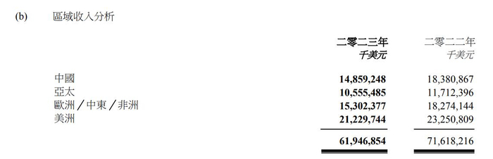 根据财报数据显示,公司该财年在中国区的收入为148.59亿美元,上年为183.81亿美元,按此计算,同比约降19.16%。
