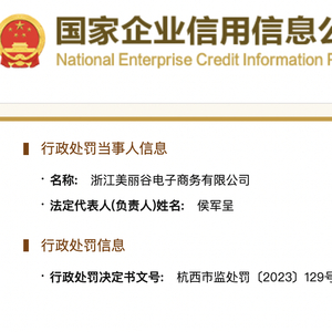 依据上述内容,杭州市西湖区市场监督管理局对美丽谷作出行政处罚,处罚内容为罚款20万元。行政处罚决定文书号为杭西市监处罚(2023)129号。