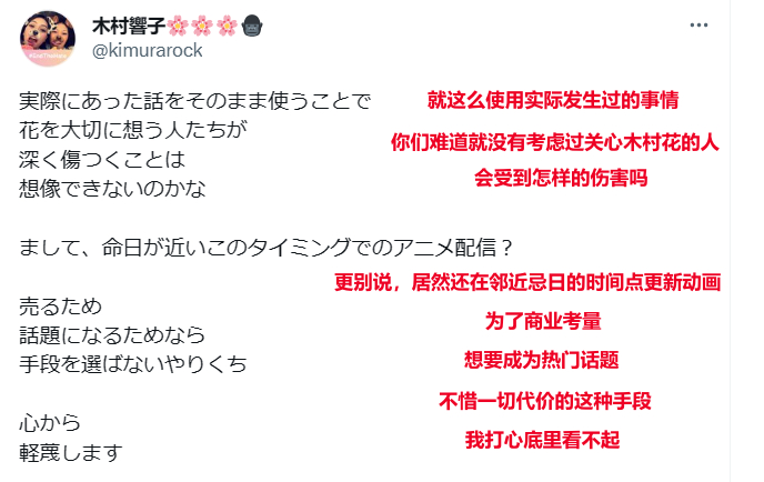 但这些的所谓“人文关怀”,或许也都只是作者与观众们的自作多情。5月21日,《我推的孩子》第6集播出后不久,至今仍未走出丧子之痛的木村花的母亲看到了这部动画,并留下了这样的评论:我打心底里看不起。