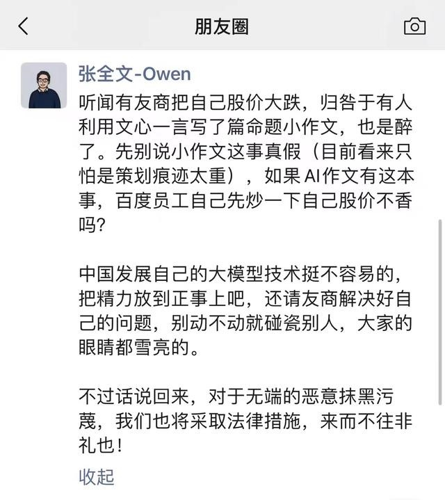 针对科大讯飞将股价下跌归因于某生成式AI写作虚假小作文的言论,百度文心一言市场部负责人张全文当晚发朋友圈回应道,“听闻有友商把自己股价大跌,归咎于有人利用文心一言写了篇命题小作文,也是醉了。先别说小作文这事真假(目前看来只怕是策划痕迹太重),如果AI作文有这本事,百度员工自己先炒一下自己股价不香吗?”