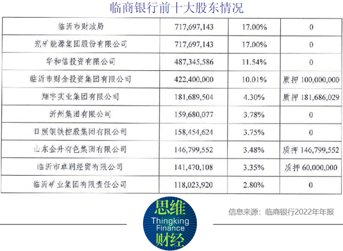 从股权层面来看,临商银行股权比较分散,并且没有控股股东。2022年年报显示,该行共有股东2685户,其中国有股东1户,法人股东44户,自然人股东2640户。