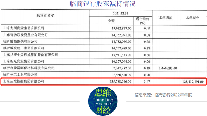 值得注意的是,2022年临商银行的一位股东山东三维控股集团有限公司(以下简称“三维控股”)几乎是清仓减持了该行的股份。三维控股在2021年持有临商银行约1.36亿股股份,持股占比为3.47%,当年是该行的第十大股东,在2022年减持了约1.28亿股股份。