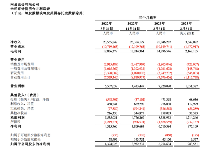 5月25日盘后,网易发布了2023年第一季度财报。Q1网易净收入250 亿元,同比增加 6.3%;归属于公司股东的净利润为68亿元,同比增长53.7%。