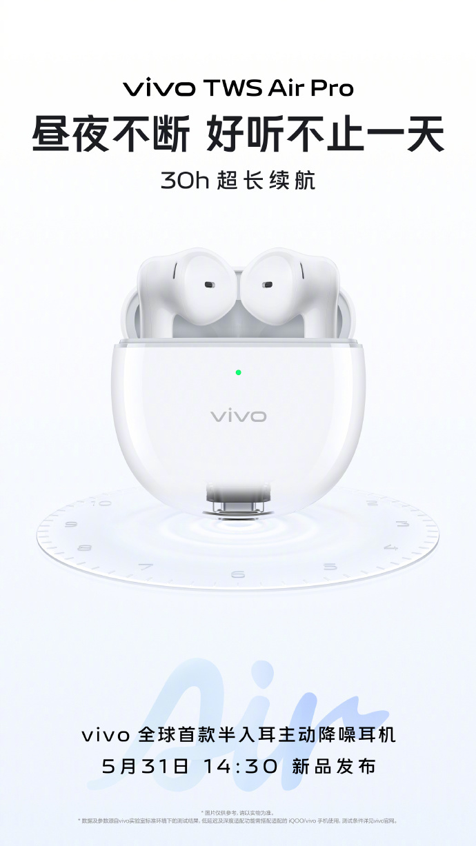 品玩5月26日讯,据 vivo 官方消息,vivo TWS Air Pro 新款耳机将于 5 月 31 日发布。
