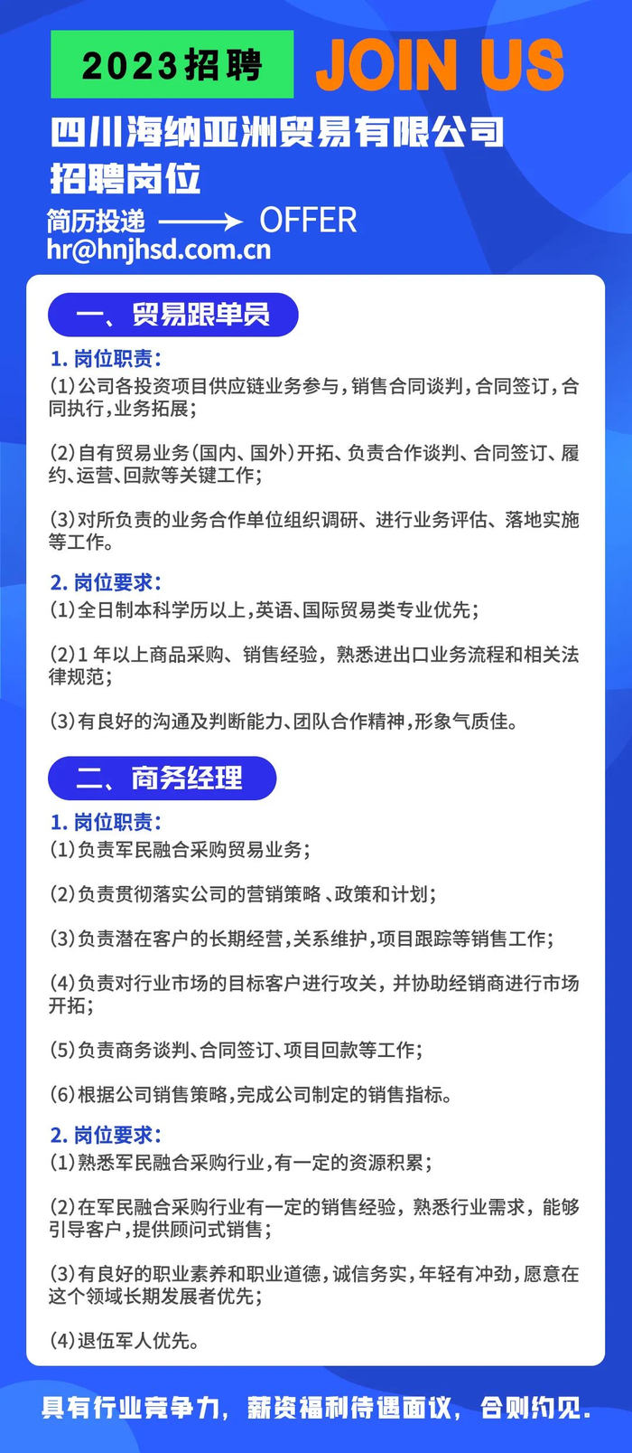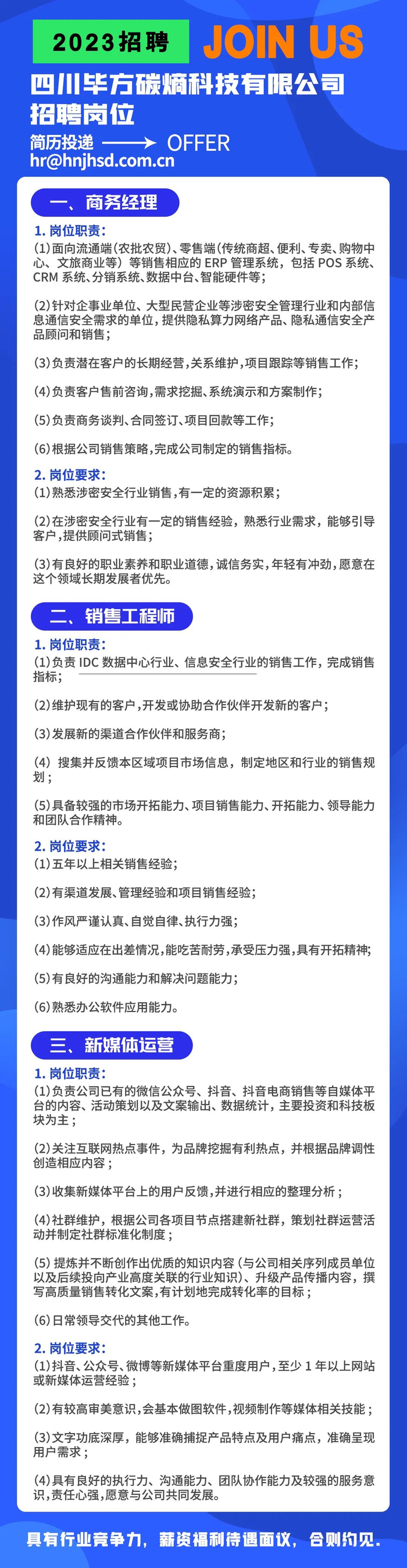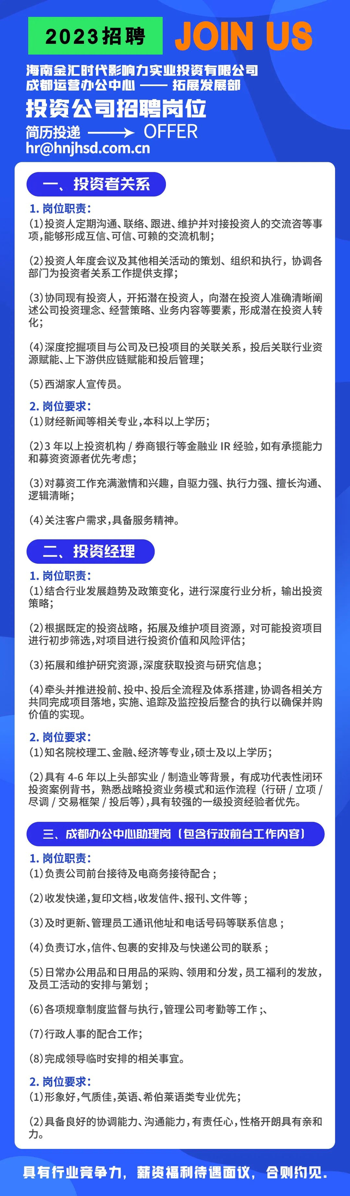 招聘职位包括投资者关系、投资经理、成都办公中心助理岗(包含行政前台工作内容)、贸易跟单员、商务经理、销售工程师、新媒体运营等职位,接受简历投递的邮箱:hr@hnjhsd.com.cn,合则约见。