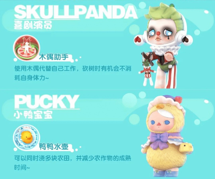 为此,游戏又还原了Molly、Dimmo、Labubu等各个IP经典角色,并为他们设计了不同的属性,比如Skullpanda的技能是砍树不耗费体力,Pucky则是减少农作物成熟时间。