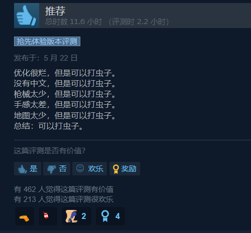 本作目前仍处于EA阶段,目前只能算个半成品。不仅只有两种模式、三个角色职业,开局枪械也少得可怜,手感也算不上优秀。