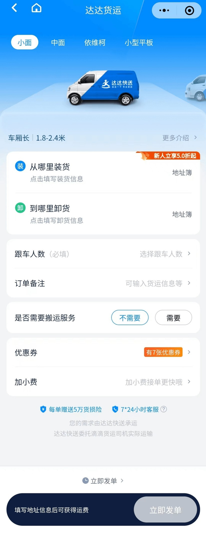用户点击进入达达货运页面,可以看到小型面包车、中型面包车、依维柯、小型平板车等车型选择,满足用户大件货物的同城货运需求。该页面底部的一行文字说明了滴滴货运和达达之间的合作关系——“您的需求由达达快送承运,达达快送委托滴滴货运司机实际运输”。