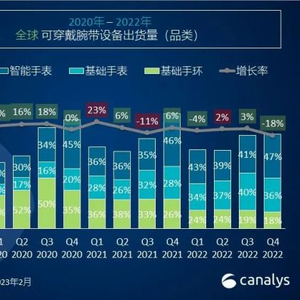 整个2022年整体来看,基础手环已经下跌了39%,与之相反的是,智能手表增长了3%,基础手表增长了21%。
