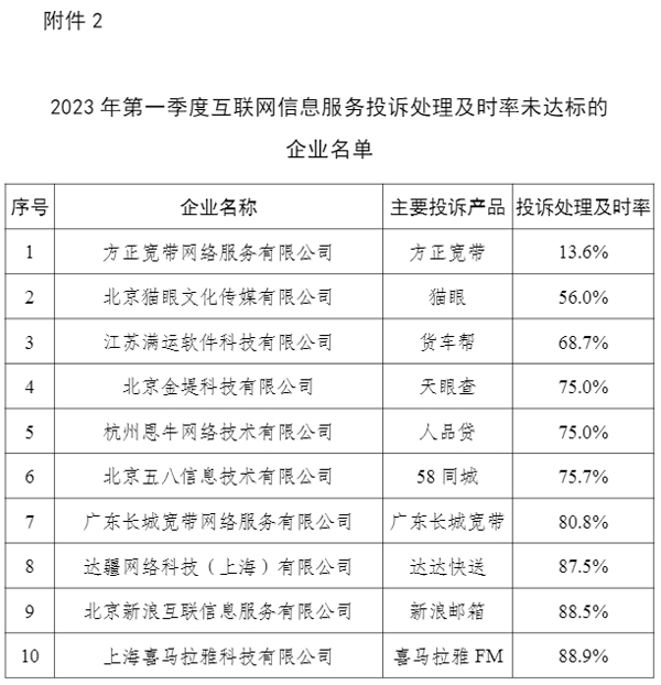 在互联网信息服务投诉方面,2023年第一季度,互联网信息服务投诉平台共收到互联网用户投诉27.9万件。其中,服务功能类投诉14.4万件,占比51.7%;客服渠道类投诉6.0万件,占比21.6%;个人信息保护类投诉3.7万件,占比13.3%;其他类投诉3.8万件,占比13.4%。在接入平台的153家互联网企业中,方正宽带、猫眼等10家企业投诉处理及时率未达到相关要求(详见附件2),支付宝、同程艺龙等投诉量增长较快,工业和信息化部已督促相关企业改进服务,解决用户反映的问题。