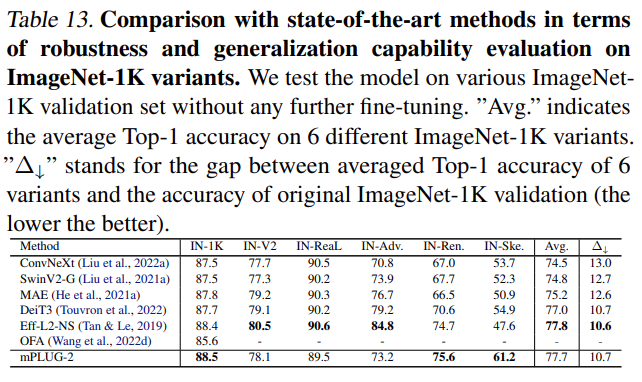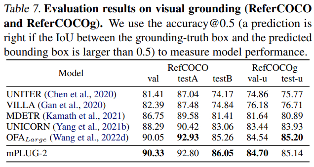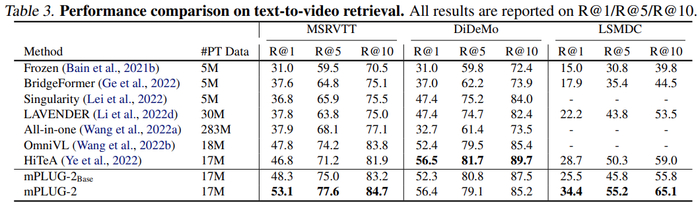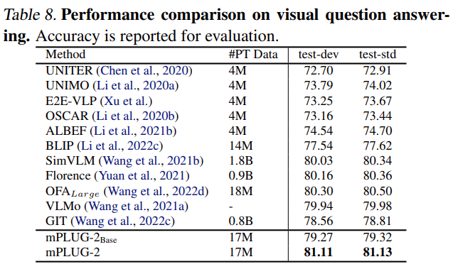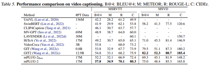 mPLUG-2 在 30 多个有挑战性的单模态和跨模态理解和⽣成基准测试中评估了 mPLUG-2 的性能,它在相似的模型大小和数据规模下取得了最先进或有竞争力的结果。