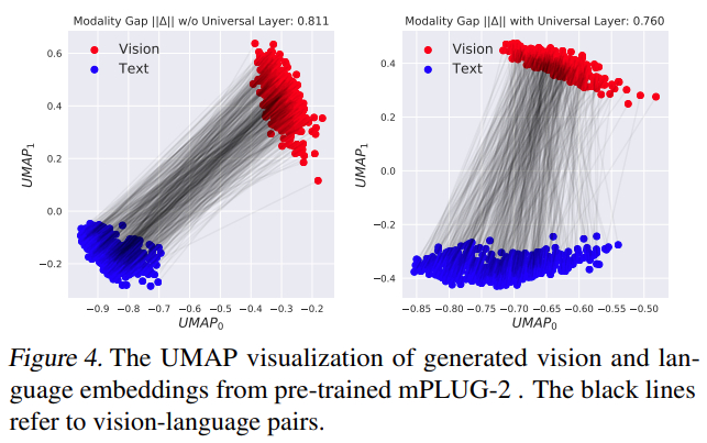 另外,研究者还发现,⿎励模态协作的通⽤层 universal layer 可以得到更小的 modality gap。